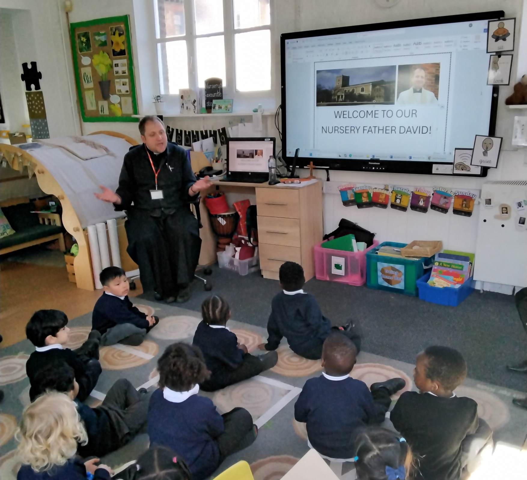 Nursery and Reception welcomed St Mary's vicar, Father David to their classrooms. He talked to them about the special time of Easter and how we celebrate it.