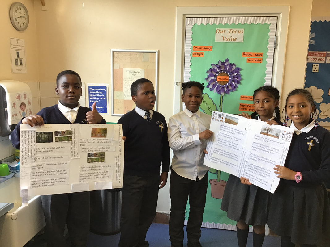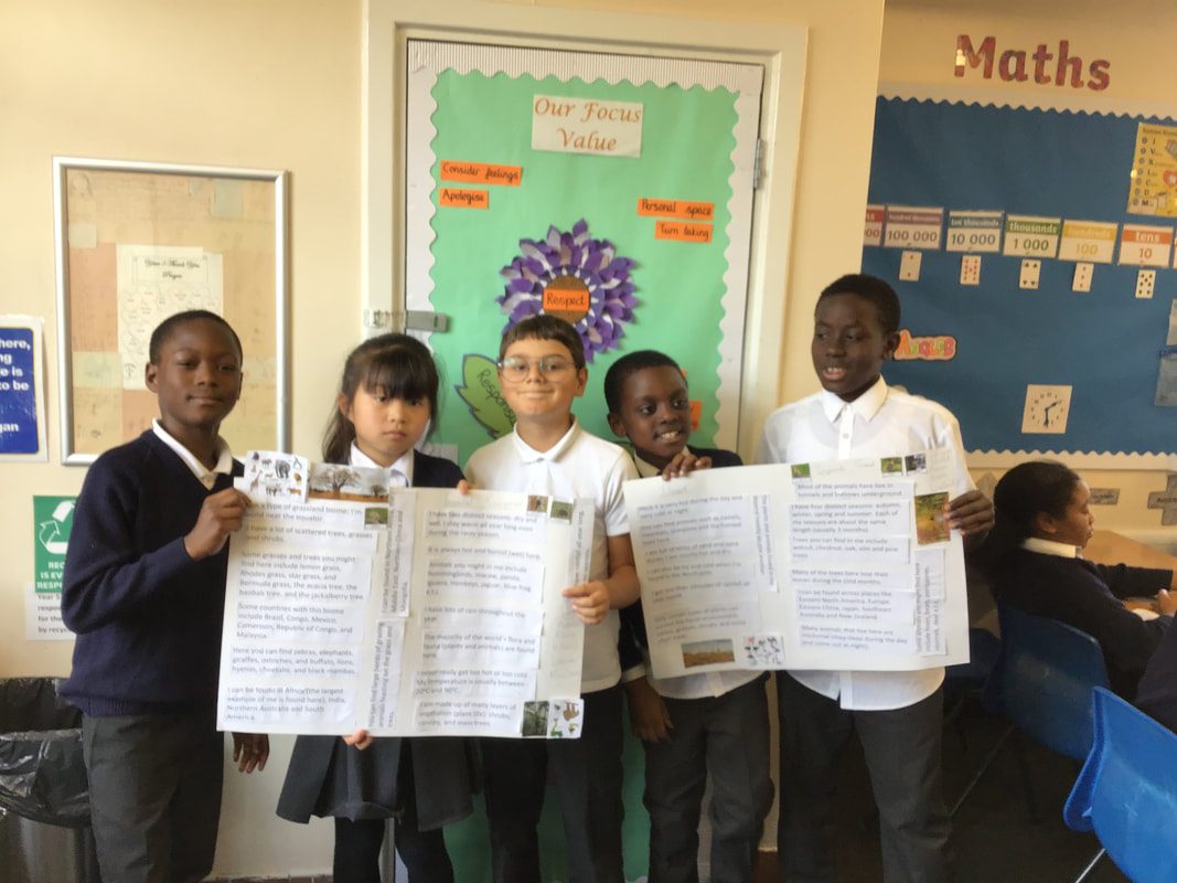 We have been learning about Biomes, their characteristics and the different fauna and flora that thrive in them. We worked in groups to sort sentence strips (which contained facts about the different biomes), animals and pictures into the right groups: Savannah, Temperate Rainforest, Tropical Rainforest and Desert.