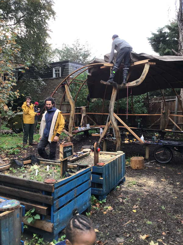Our children and community were thrilled to see the Forest School garden coming to life as the area was landscaped and the main features added. The outdoor classroom frame was constructed, alongside the Tree House, Fire Pit, Mud Kitchen and the Pond.